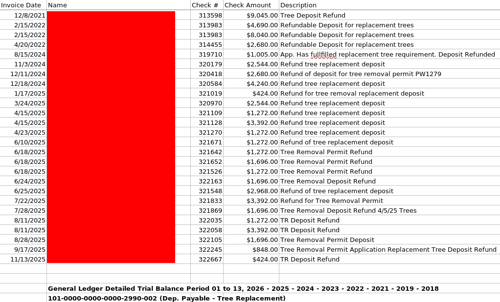 A returned deposit represents on-site tree planting. There were zero in 2023.
